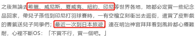 近些年,林美贞还先后去了希腊、威尼斯、夏威夷、纽约、印尼,以及日本等地旅游,每到一个地方都会购入各种纪念品回家。连在日本看到的风铃,都能让她心动。