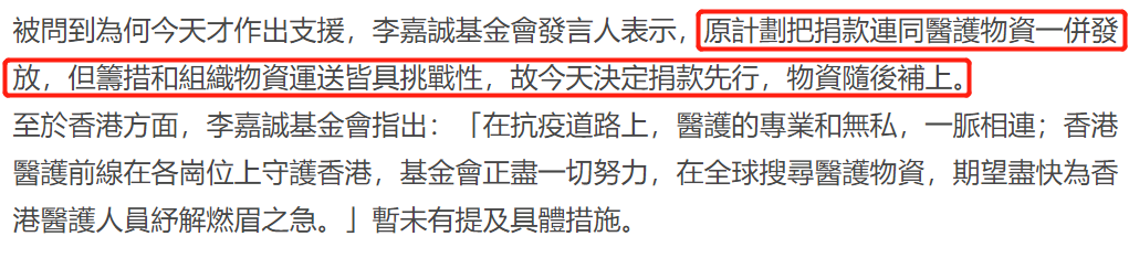 李嘉诚原本计划是筹集到物资和资金,一并发放,不过因为现在的医疗物资非常紧张,所以筹备齐物资需要时间,于是李嘉诚再次决定,先把资金送到一线,物资随后补上。