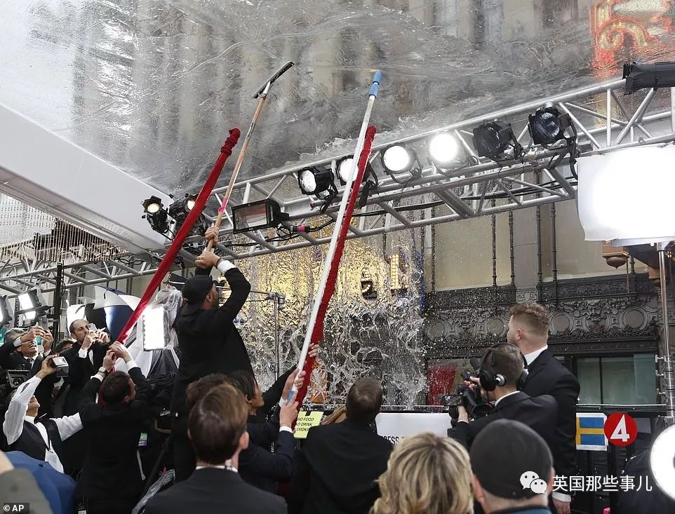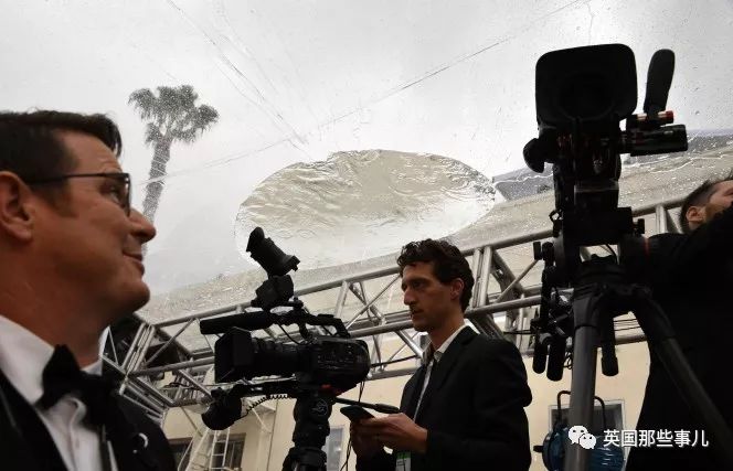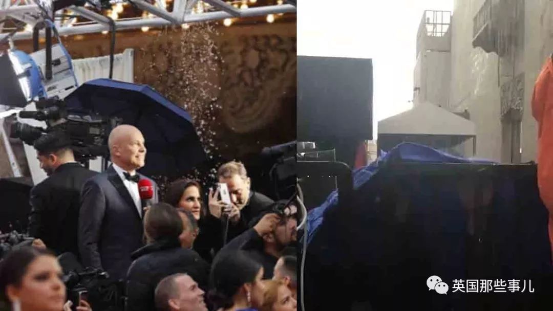 主办方只能在红毯上方铺了张塑料膜充当临时屋顶。