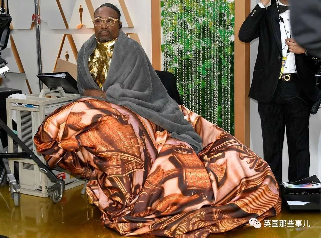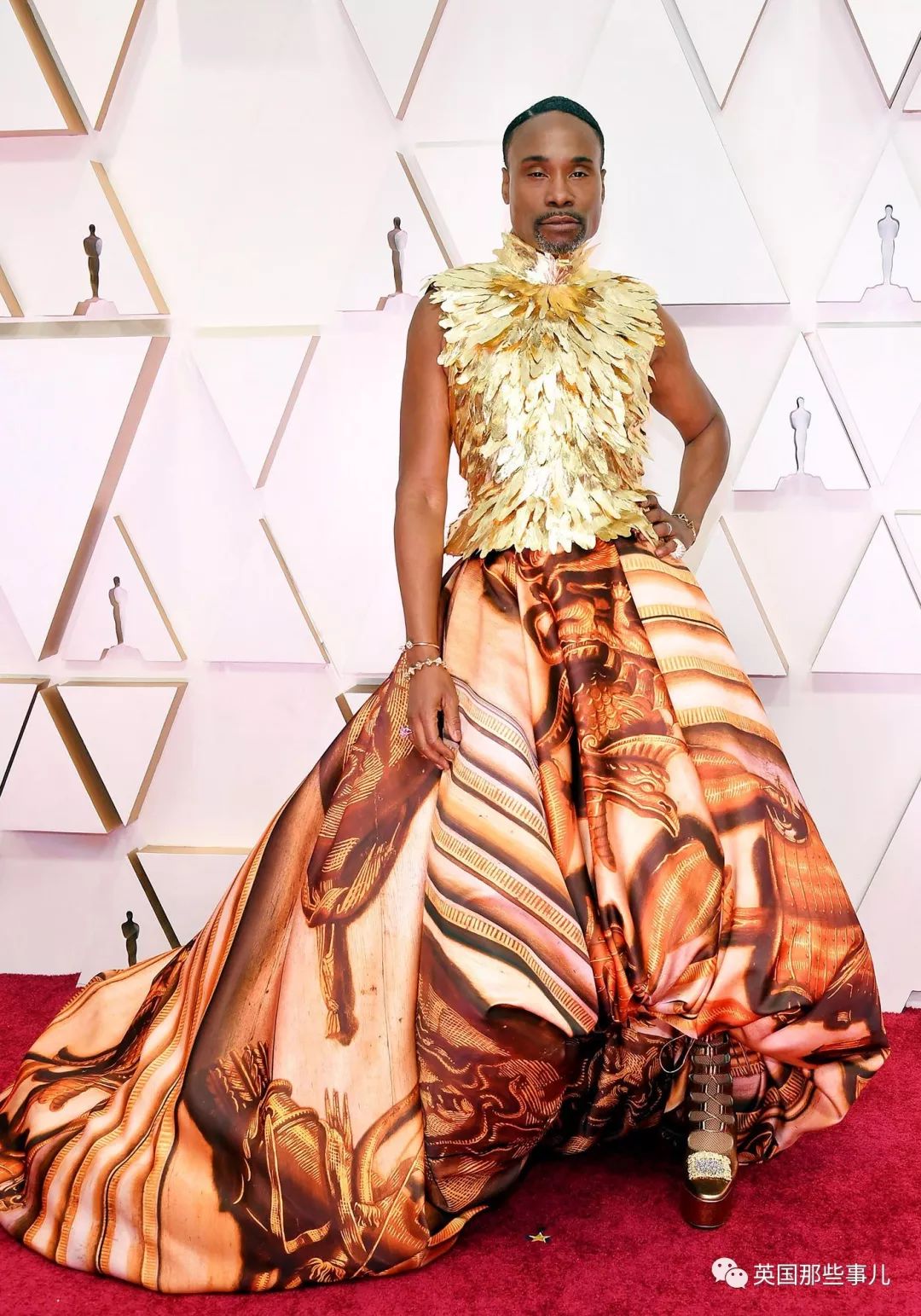 Billy Porter还是一如既往的独自美丽,金色羽毛加印花长裙,气场全开,