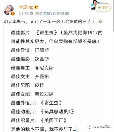 看完获奖名单, 网友们震惊的发现,李现之前对奥斯卡奖项的预测,正确率竟然高达九十!