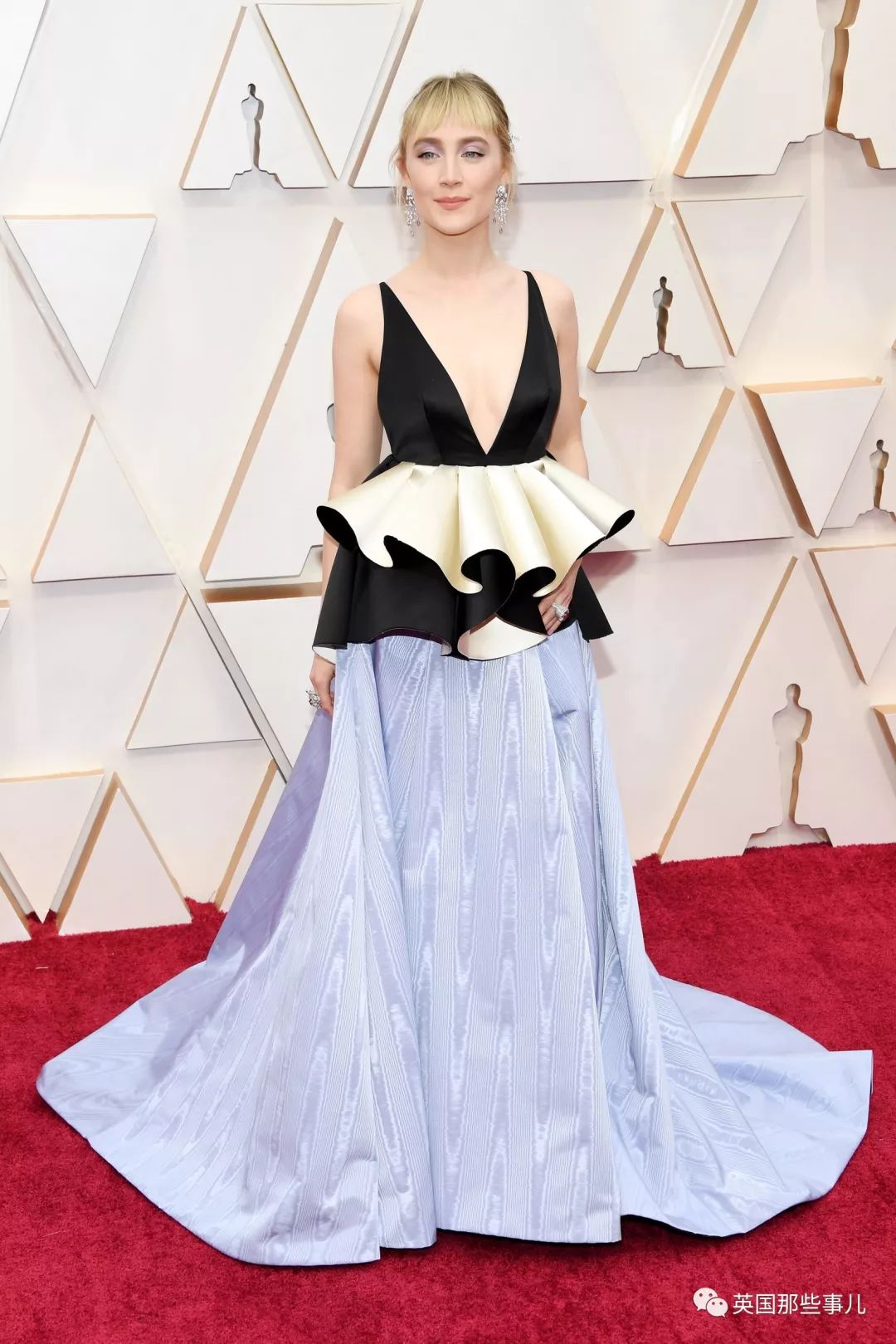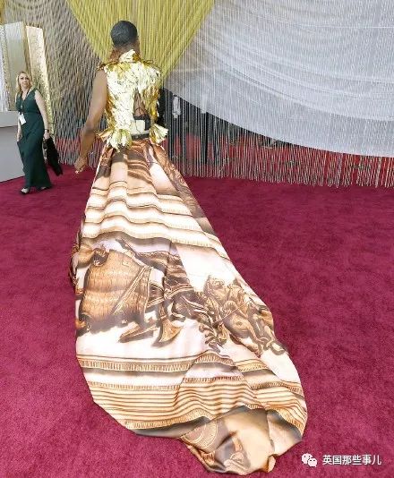 她这套服装可能是今天被讨论最多的一套, 不仅美,还很有意义。 她的披风上绣了一圈没有提名奥斯卡的女导演名字,其中有《小妇人》的导演Greta Gerwig,《别告诉她》的导演王子逸等等。