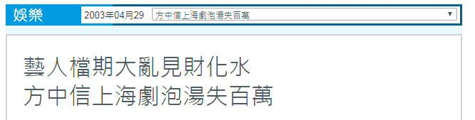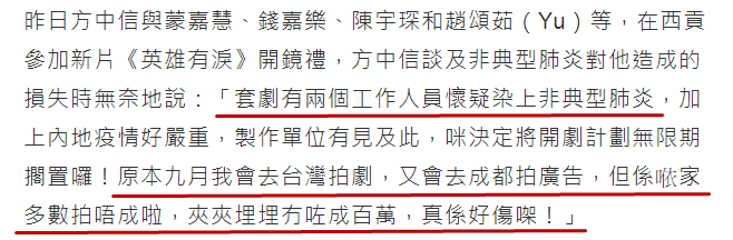 方中信原本要到上海和台湾拍剧的,因为有工作人员疑似中招,内地单位搁置了剧集,各种工作泡汤令方中信损失百万元;