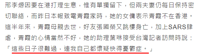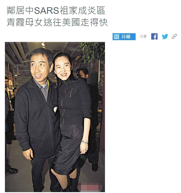 林青霞的豪宅对面,就出现了一例沙士案例,林青霞心情很不好,连她的助理都说:“这些日子很难过,连我自己都怀疑快得忧郁症。”