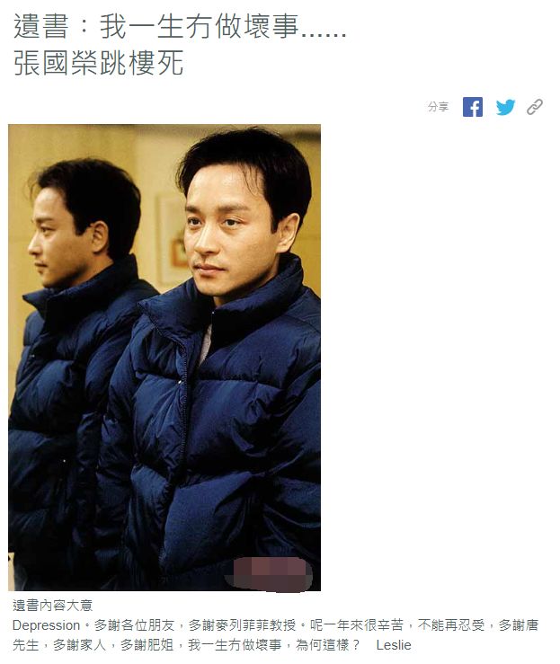 2003年4月1日,张国荣在遗书里写下“我一生没有做坏事,为何这样”,随即跳楼自杀。