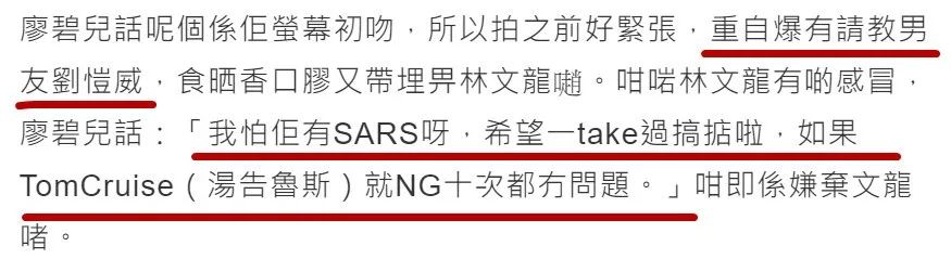 不过因为林文龙那时刚好有点感冒,廖碧儿就“嫌弃脸”说:“我怕他有SARS,最好一take过啦。”后来又补充:“如果是TomCruise就十次都没问题”