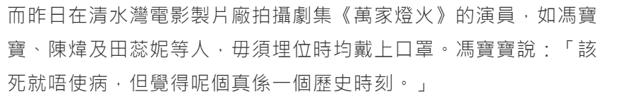 还请一帮艺人录制了《同舟共勉香港心》,齐声唱歌颂医护者。不过挤了四十多人的录影厂里,很多艺人没戴口罩,又被媒体DISS防范意识不足。