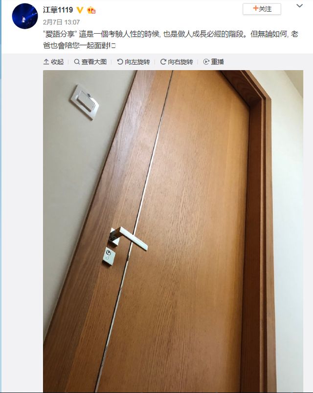 2月7日,江华在微博晒出一张房门的照片,配文说“这是一个考验人性的时候,也是做人成长必经阶段。无论如何,老爸陪你一起面对”。