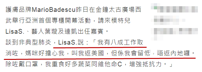 模特LisaS.80%工作被叫停,与她一同拍广告的叶璇工作同样减产;