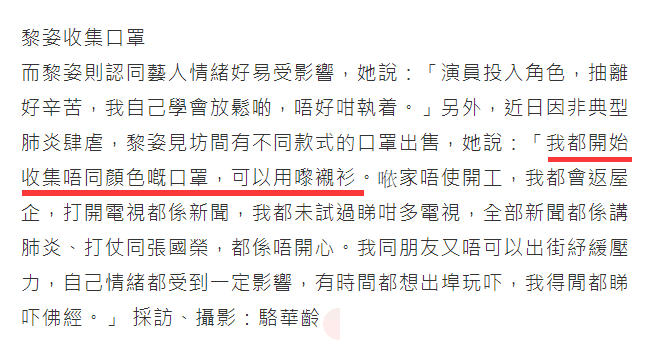 黎姿也说各种新闻让她很不开心,但她的治愈方法是,收集不同颜色的口罩,用来衬衣服,学着让自己放松不要太执着。