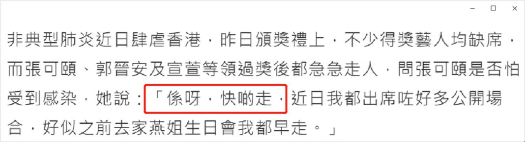 3月份的一场商业颁奖礼,不少得奖艺人缺席,到场的张可颐、郭晋安、宣萱领过奖也是“急急脚走”。