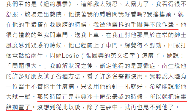 多年后林青霞写文回忆张国荣的离世,她说沙士期间曾和哥哥一起看电影,被他震抖的手吓得不敢作声,过后她向施南生了解情况,断定哥哥得的是抑郁症。