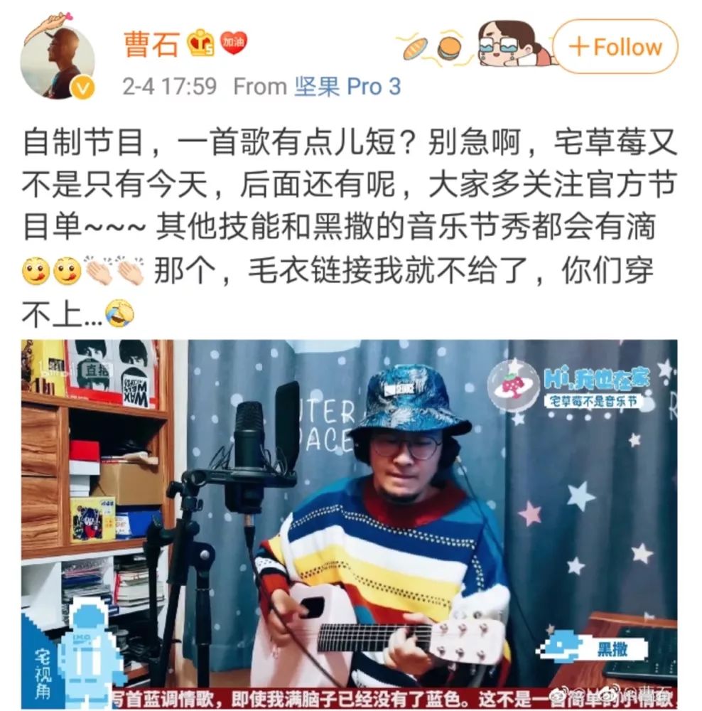 低苦艾乐队主唱带着儿子温馨弹唱《初八下午的歌》,献给在疫情一线“战斗”的医护人员。 凉粉乐队的5位成员 ,完成了一次线上“云阿卡贝拉”合唱。 黑撒乐队的主唱曹石在自制视频中弹唱《蓝调情歌》。 万万没想到,他穿的毛衣引起了直播网友的集体注意,从B站弹幕里追到微博求淘宝链接。