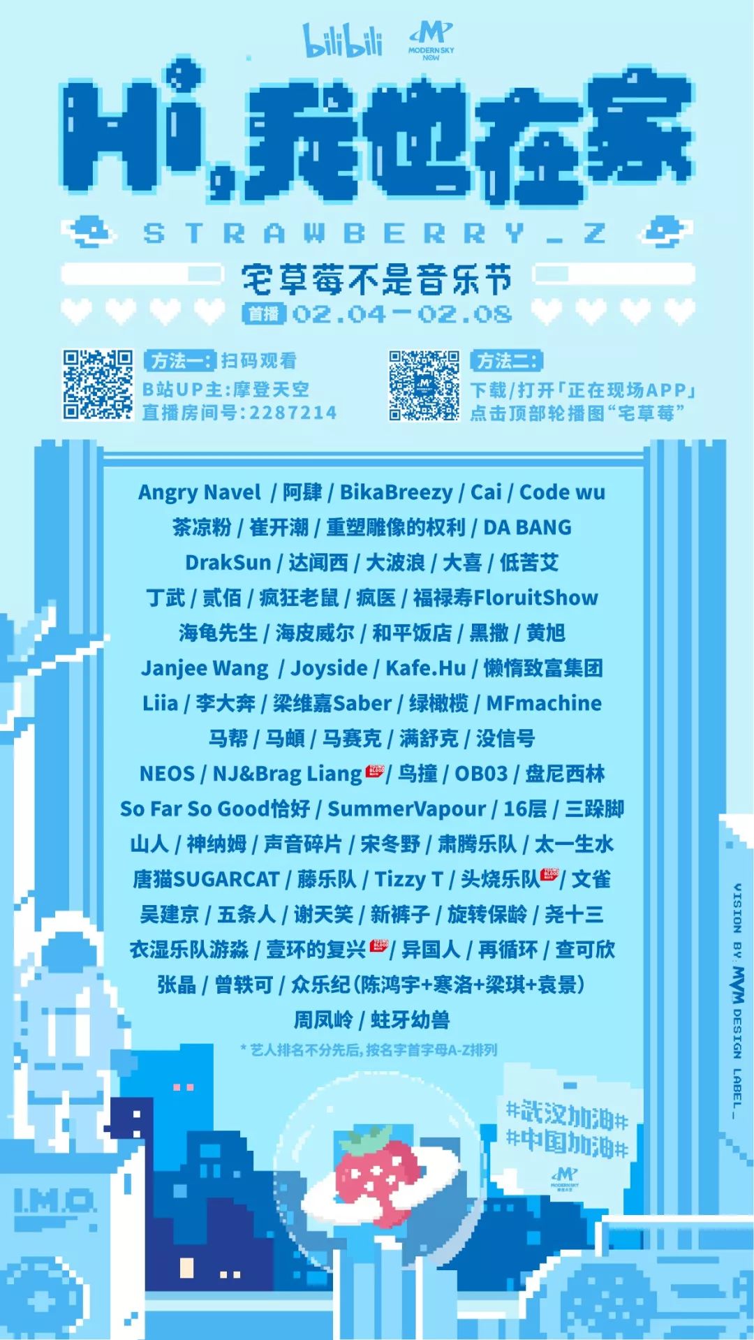2020年,草莓音乐节的主题是“Hi,我也在”,武汉一直是草莓音乐节每年的首发站。 疫情突袭,草莓音乐节无法如期举行。 摩登天空与B站合作,“草莓音乐节”变身为“宅草莓”,主题也巧妙地增加了一个字,变为 “Hi,我也在家”。 “宅草莓”活动连续直播5天,每天直播时长在6小时左右。