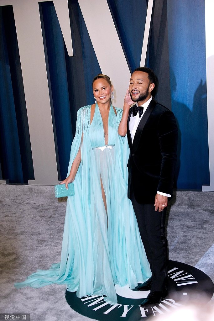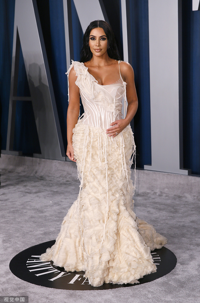 当地时间2020年2月9日,好莱坞,第92届奥斯卡颁奖礼,名利场派对。金·卡戴珊穿白色长裙和坎耶·韦斯特(Kanye West)秀恩