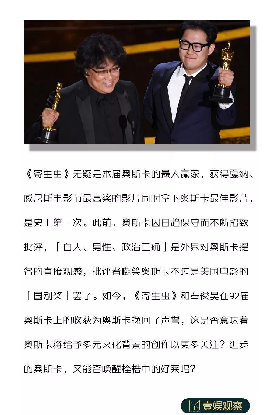 其中,《寄生虫》获得最佳影片、最佳导演、最佳原创剧本、最佳国际影片奖项,成为今年奥斯卡最大赢家。