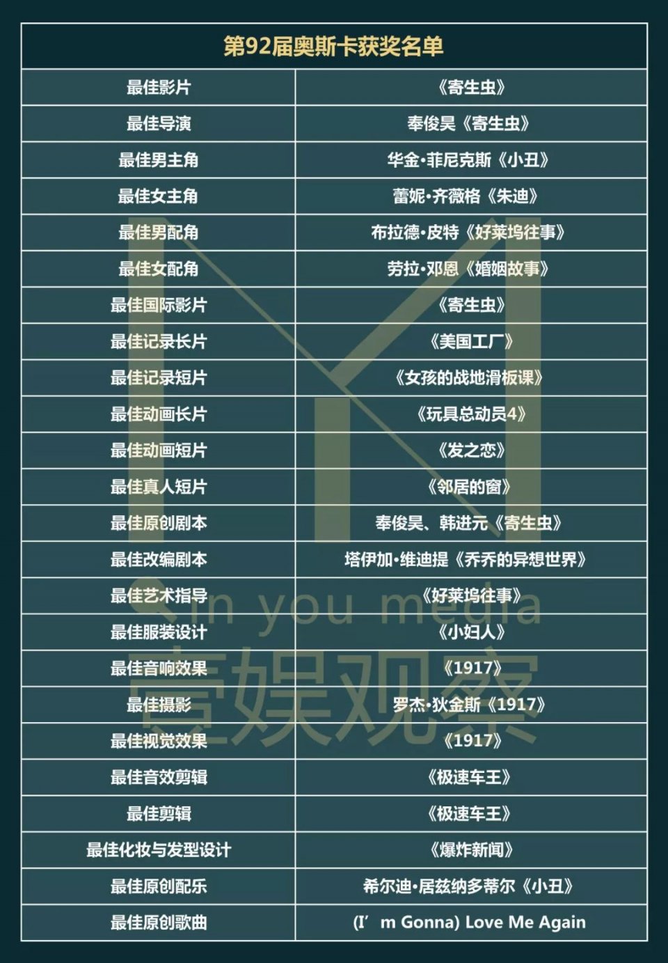 北京时间2月10日,第92届奥斯卡颁奖典礼落下帷幕,24项大奖分落各家。