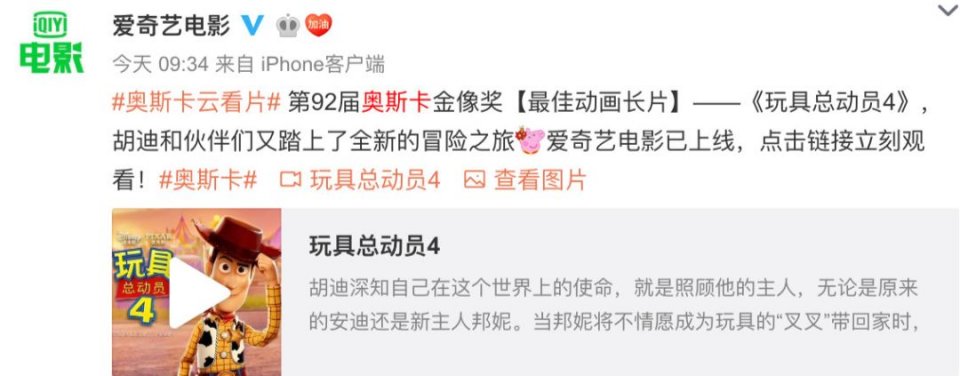 就在此时,爱奇艺电影官方微博在2月10日早10点陆续发布消息,奥斯卡颁奖典礼进行时,再放大招。宣布奥斯卡相关获奖作品,《玩具总动员4》,《好莱坞往事》,《寄生虫》,《乔乔的异想世界》,《小妇人》,《婚姻故事》,《极速车王》等影片已经购买到网络版权,即将登陆爱奇艺平台。