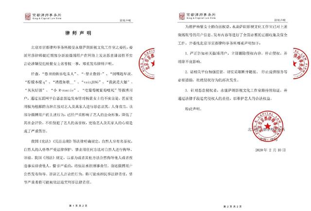 2月10日,杨紫在社交网站上晒出了最新的律师函,发文表示:连日来不断升级的造谣谩骂,甚至波及到杨紫家人的诅咒让他们无法保持沉
