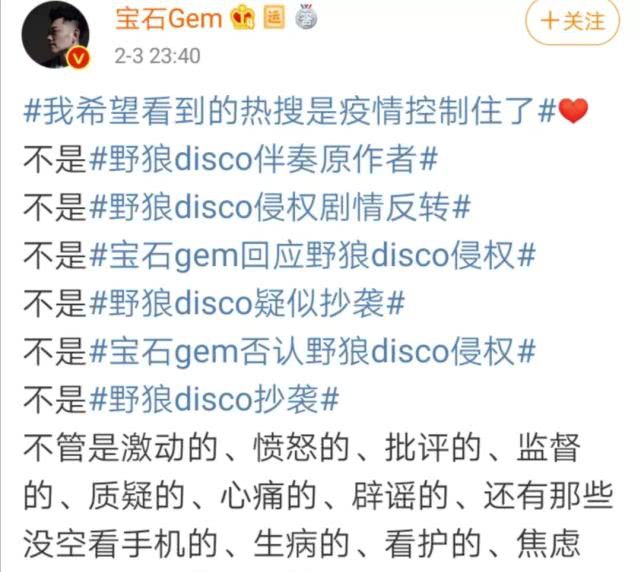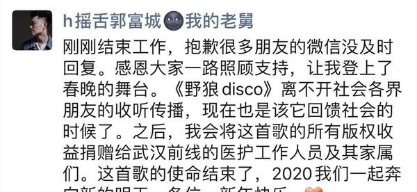 前不久疫情爆发,董宝石将《野狼disco》所有版权收益都捐给了武汉前线的医护工作人员及家属,