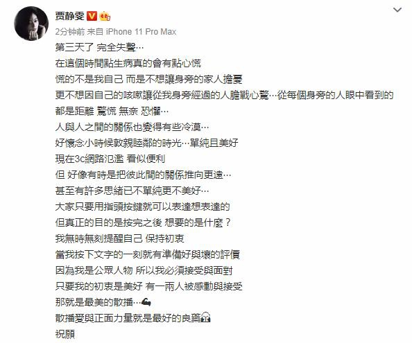 众所周知,近期因为湖北武汉疫情,每个人的内心多多少少都会有些紧张和沉重,而贾静雯在这个时候生病,的确令人担忧。再加上旁人的“冷漠”,相信她内心更加不好受。此次她也发布长文感慨人情冷暖,称“很怀念小时候敦亲睦邻的时光…单纯且美好,现在网络泛滥,看似便利,但好像有时是把彼此间的关系推向更远”,一番感慨令人心疼。不过她文末也不忘祝愿大家平安喜乐度过每一天,非常暖心。