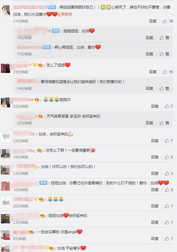 看到贾静雯的发文和晒照后,网友纷纷留言鼓励:“啊姐姐要照顾好自己!心疼死了,其他不好的不要管,你要加油,我们永远爱你”、“你怎么了啊?一定要保重啊”、“感冒了吗?快点好起来吧!”。