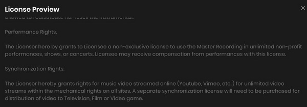 这场纠纷里有一个疑点:网站上写的购买权益和最后合同正文里的权益不一样。我试了一下,把选中的beat放进购物车,点击License Preview(授权许可预览),Performance Rights(表演权益)部分里的授权就会从“For Profit Live Performances”(商业演出)变成“unlimited non-profit performance”(无限制次数的非盈利演出)。这是怎么回事?