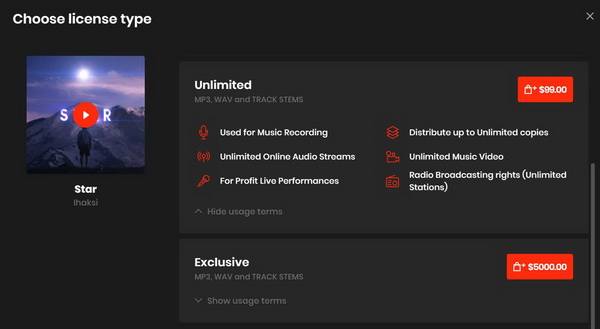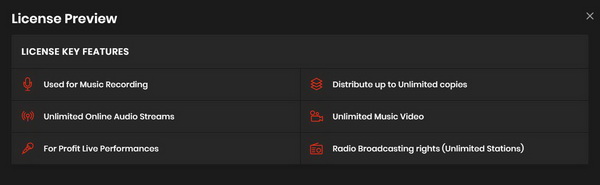 加入购物车后,点击License Preview(授权许可预览)后同样醒目地标注 “For Profit Live Performances”(商业演出)。