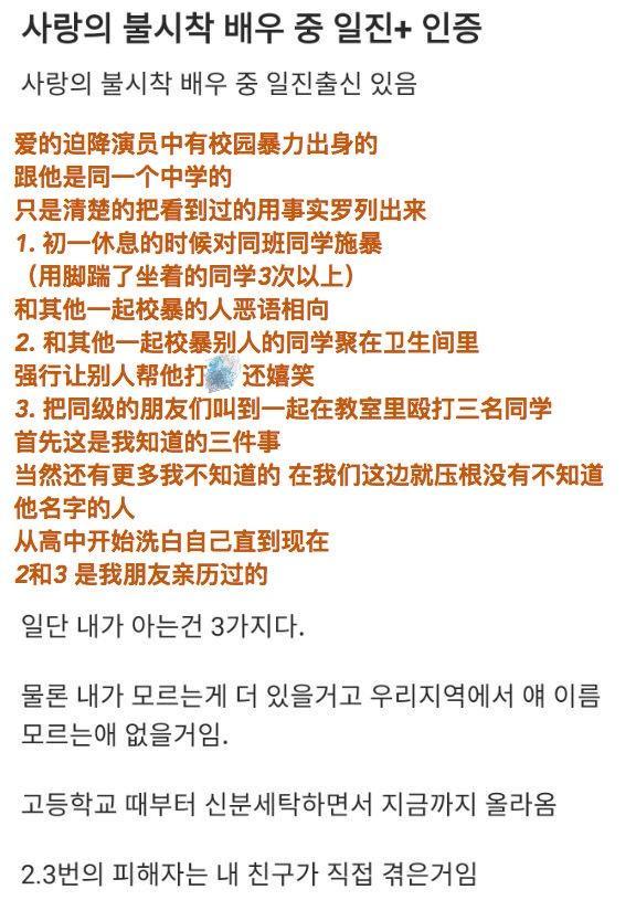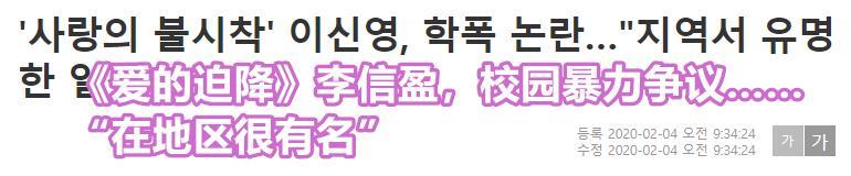 2月4号,有韩国媒体报道称,在《爱的迫降》中饰演朴光范的22岁男演员李信盈受到校园暴力质疑,网上有自称是他同学的网友曝出各种细节。