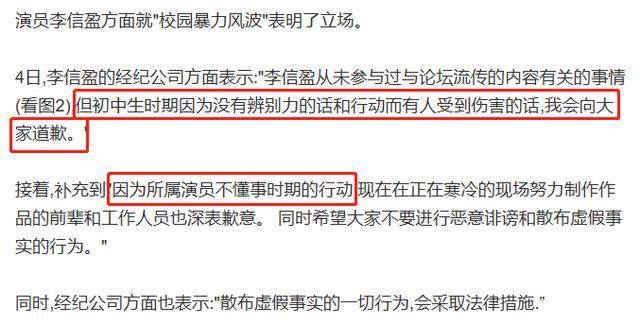 李信盈的公司随后表示“正在核实,会马上发出官方立场”,然后用“不是事实”进行了回应。几小时后,公司的正式声明称李信盈没有参与论坛流传内容,但初中时期是没有辨别力的时期,如果有人受到伤害,会向大家道歉。