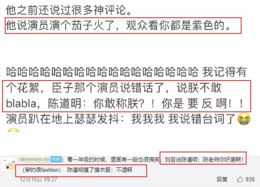 有网友指出陈道明一直都特别有梗,曾经说过“演员演个茄子火了,观众看你都是紫色的”。