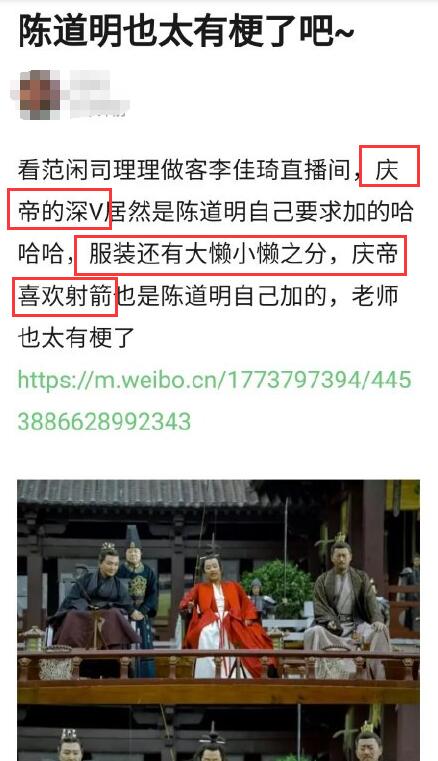 在《庆余年》中,陈道明的服装很有梗,被调侃为一个爱穿深V的皇帝。无论什么场合,服装造型基本都是深V,动作幅度稍微一大就会露出很大一条缝。近日通过剧中主演李纯的采访透露,衣服居然是陈道明自己设计的。