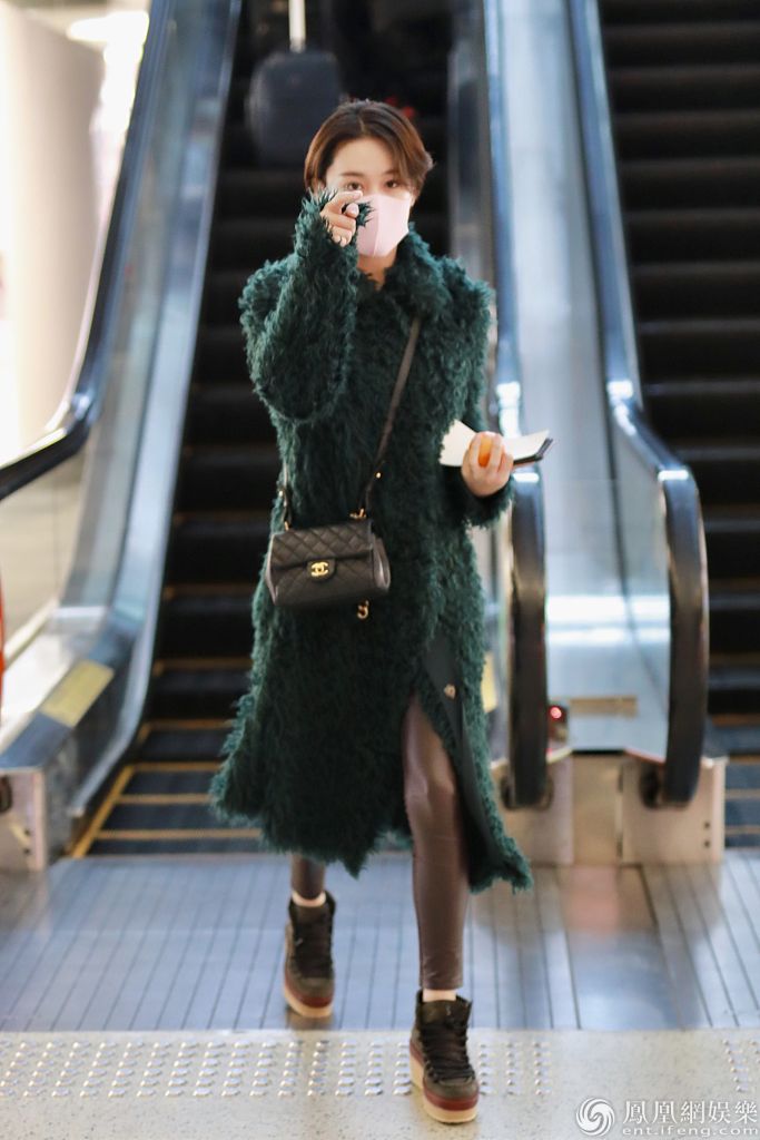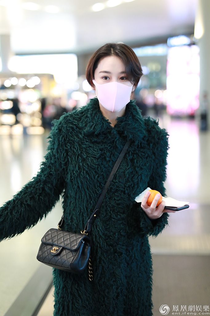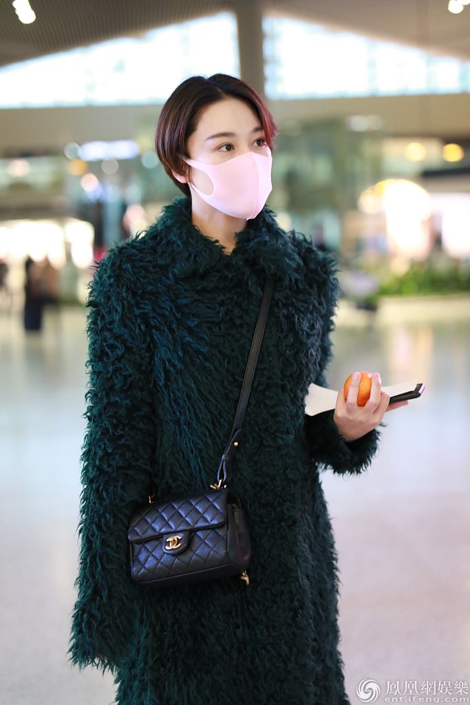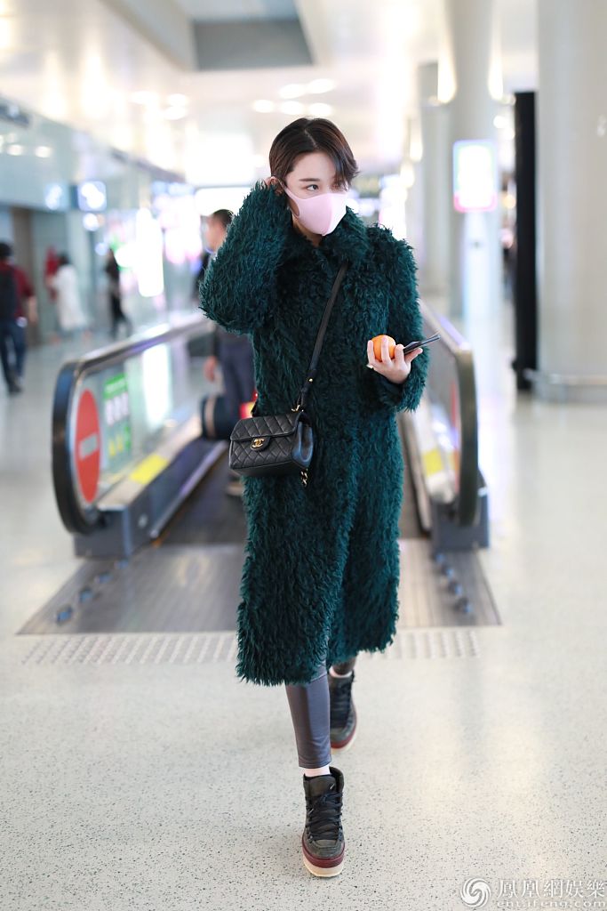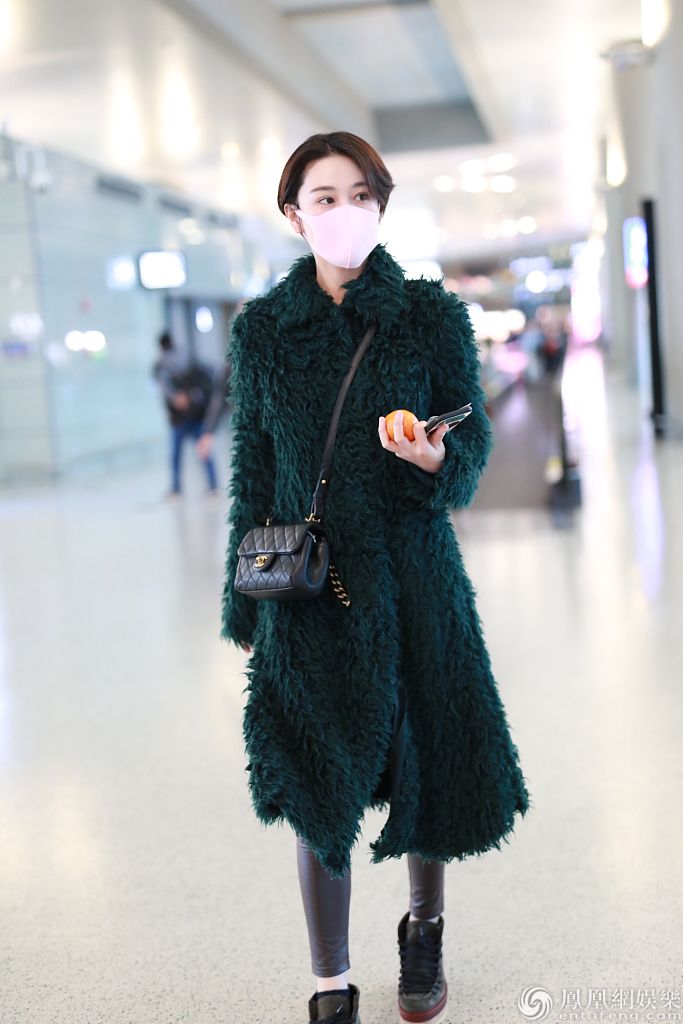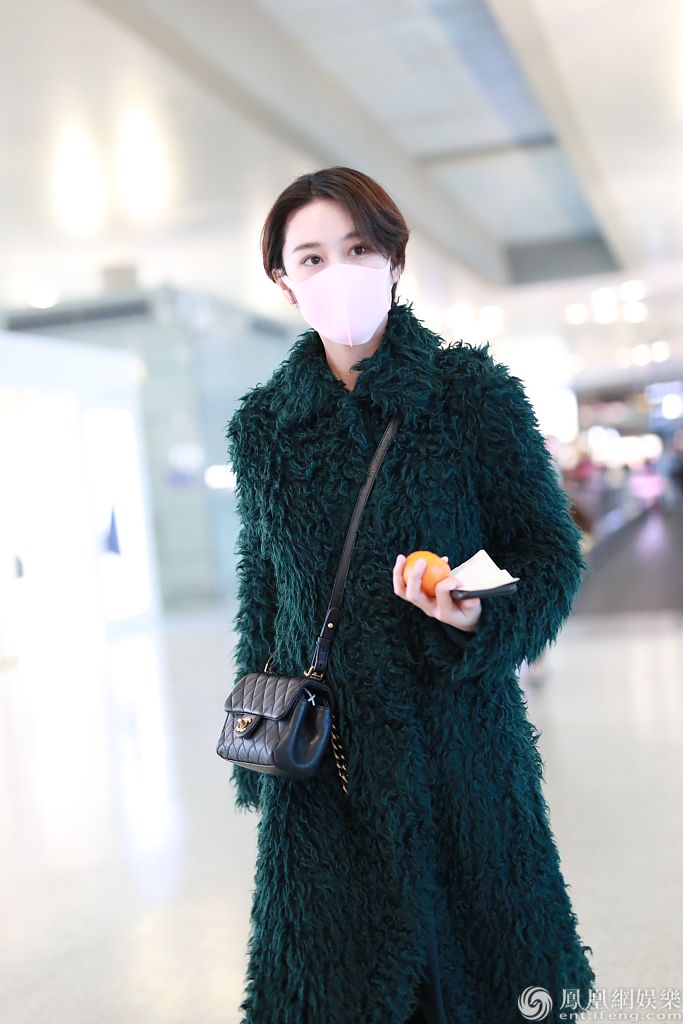 2019年12月27日,上海,张馨予现身机场。她戴粉红色口罩,穿墨绿色大衣搭配小皮裤,双腿纤细又美又飒,手拿小橘子上演反差