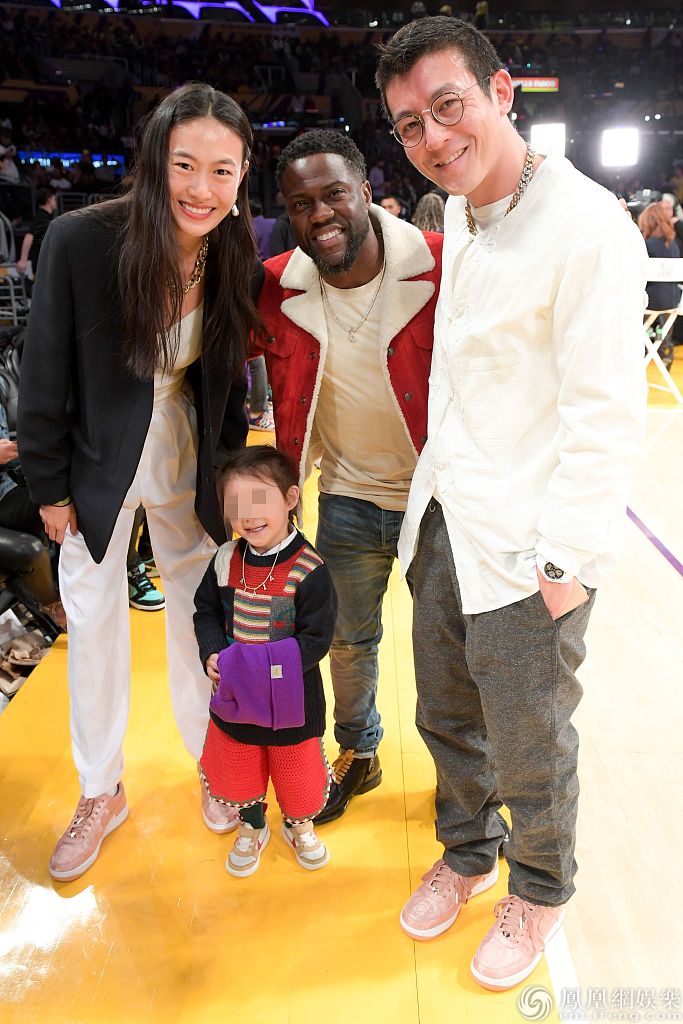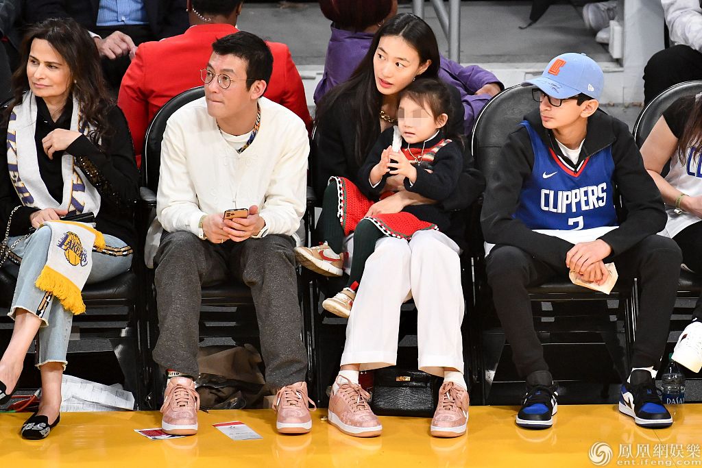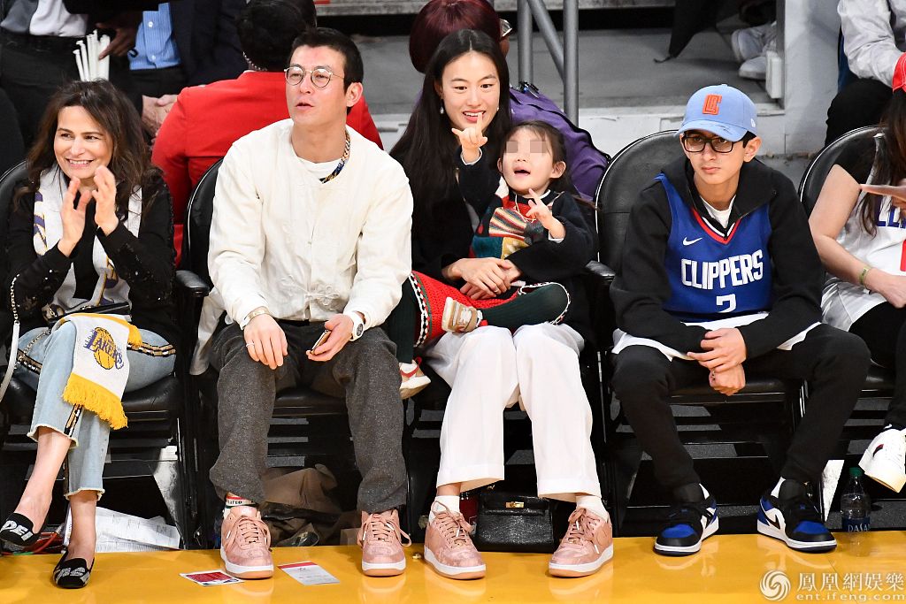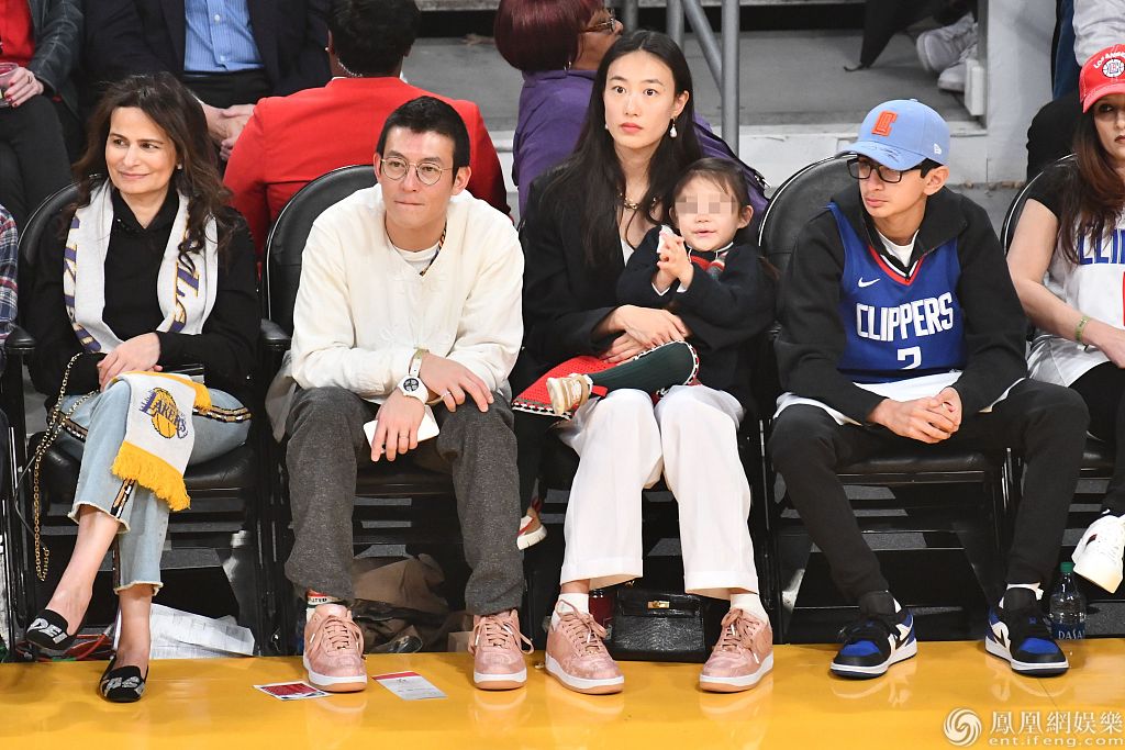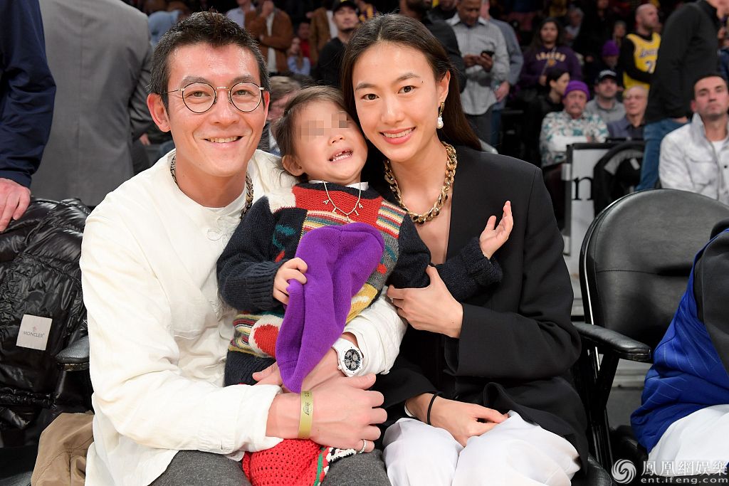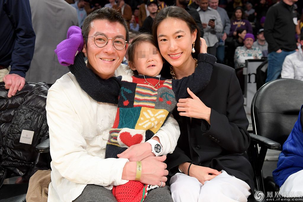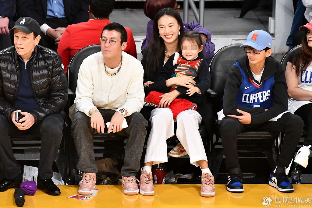 2019年12月25日,美国洛杉矶,陈冠希、秦舒培携女儿现身球场观赛。秦舒培身穿黑衣和白裤温婉知性,陈冠希穿白色卫衣笑容灿烂,两人紧搂女儿合影十分温