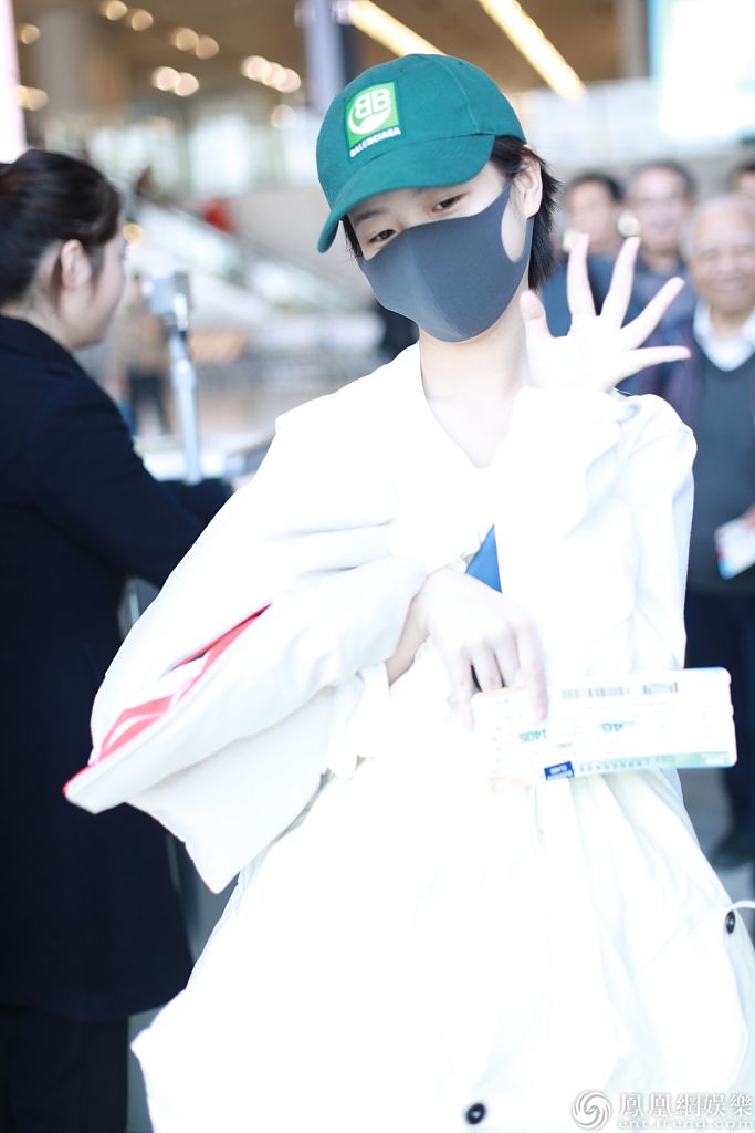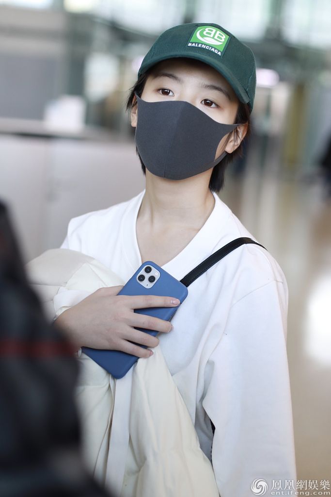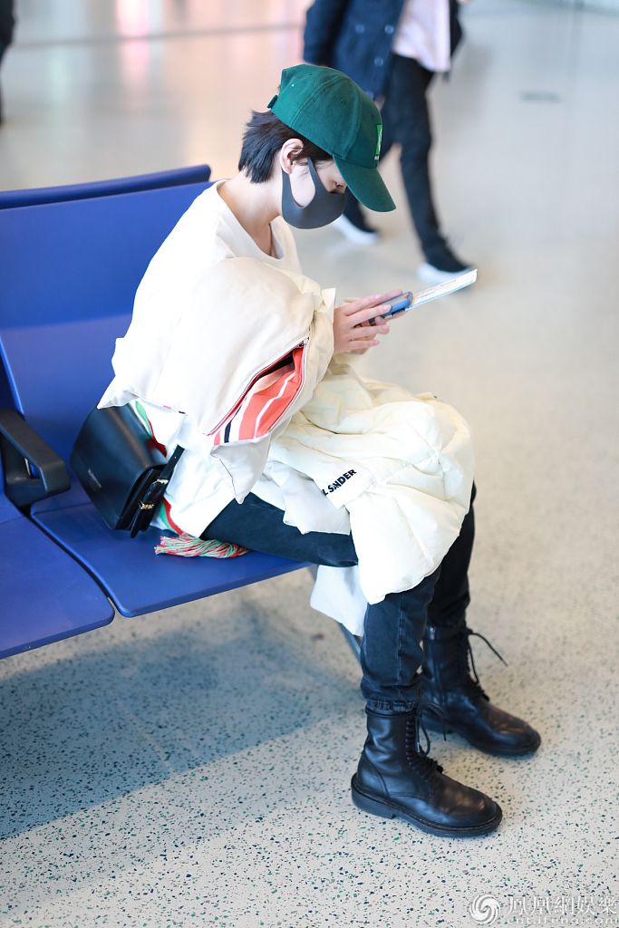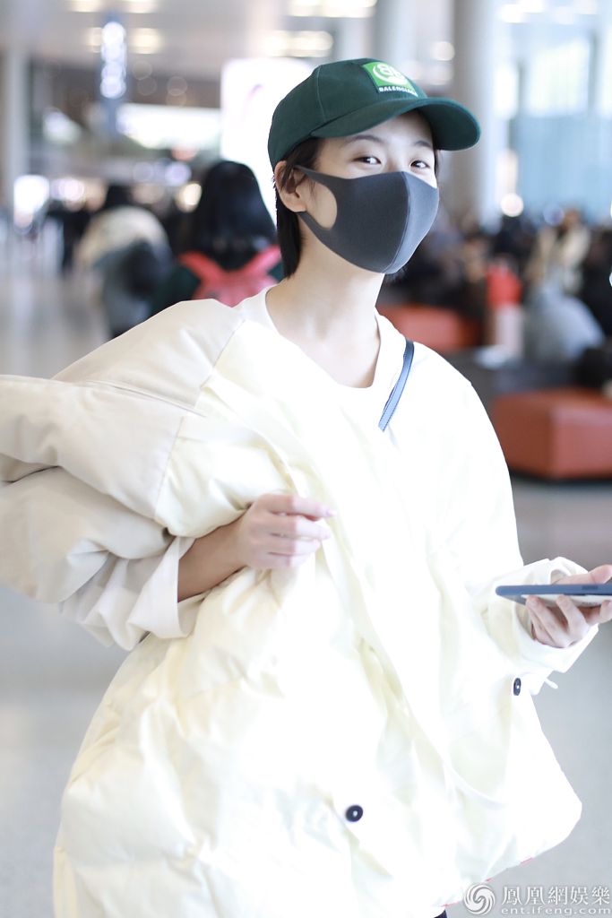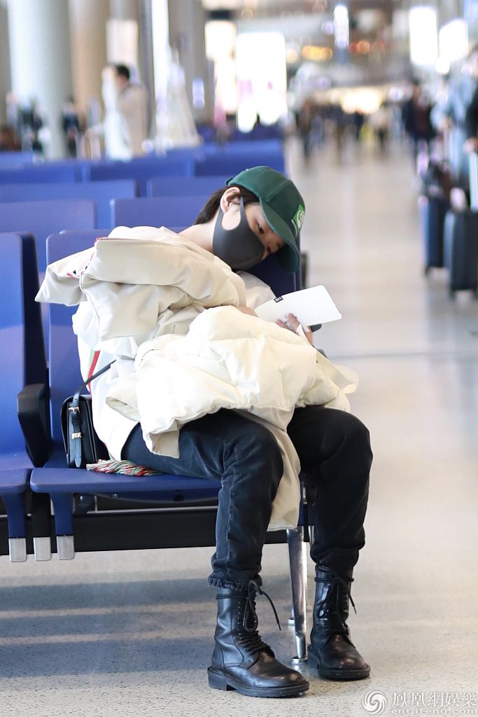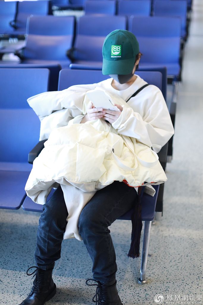 2019年12月27日,上海,李庚希现身机场。她戴着绿色棒球帽身穿白色卫衣和黑色马丁靴十分帅气,抱着羽绒服“瘫”在椅子上玩手机,十分可
