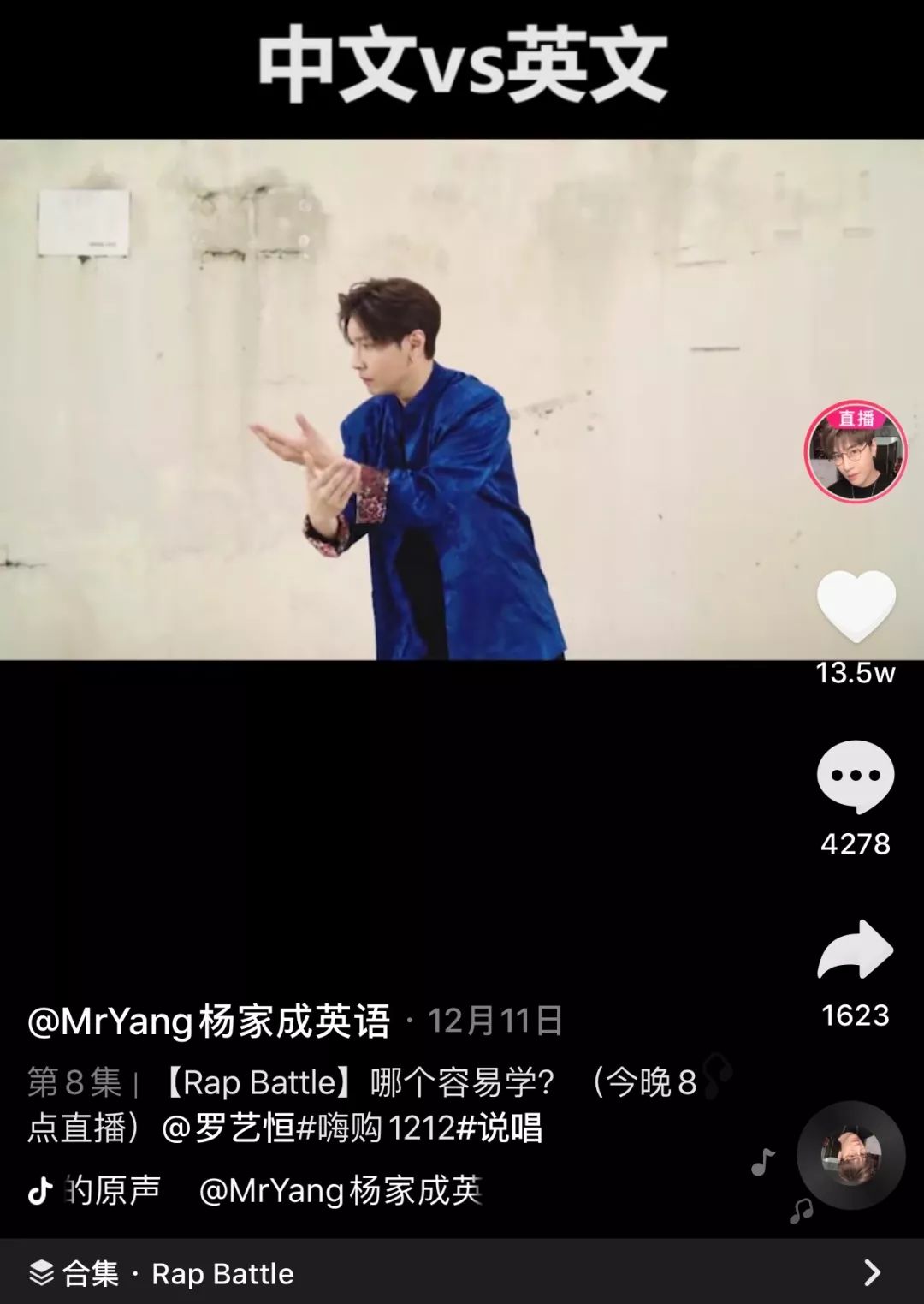 在抖音直播,脱口秀、精分表演、情景剧、中英文Battle(对决)等一系列大众喜欢的娱乐内容形式,是杨家成英语教学中最重要的内容。
