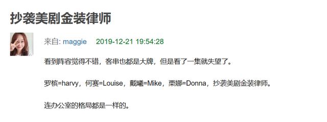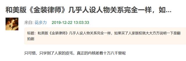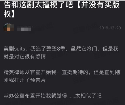 原来在《精英律师》开播的第二天,就有很多网友发现了该剧的剧情与美剧《金装律师》十分相似,网友对两者中的人物进行了对比,发现实在是太像了,所以陈词激昂的去打差评。还有很多网友表示结尾写有买版权了,然而我把结尾降低0.5倍速也没有找到,最后还是有网友晒出了截图,原来写的是鸣谢某集团,但是这些都遭到了网友的吐槽,表示并不能代表买了版权。