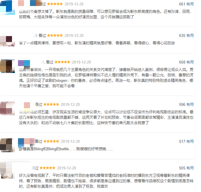 《精英律师》刚刚开播之时好评不断,豆瓣评分全是5星好评,观众也纷纷表示要追剧了。再加上靳东的加盟,简直是如虎添翼,因为靳东的霸道总裁形象一直以来都是受万千少女追捧的。从《欢乐颂》中的谭宗明到《我的前半生》中的贺函,靳东饰演的精英男神形象简直就是收视率的保证。
