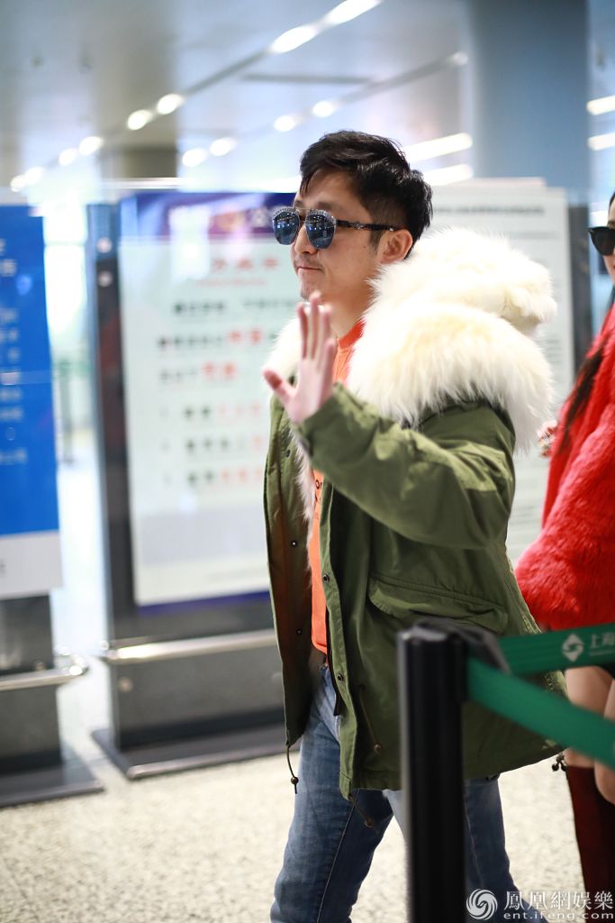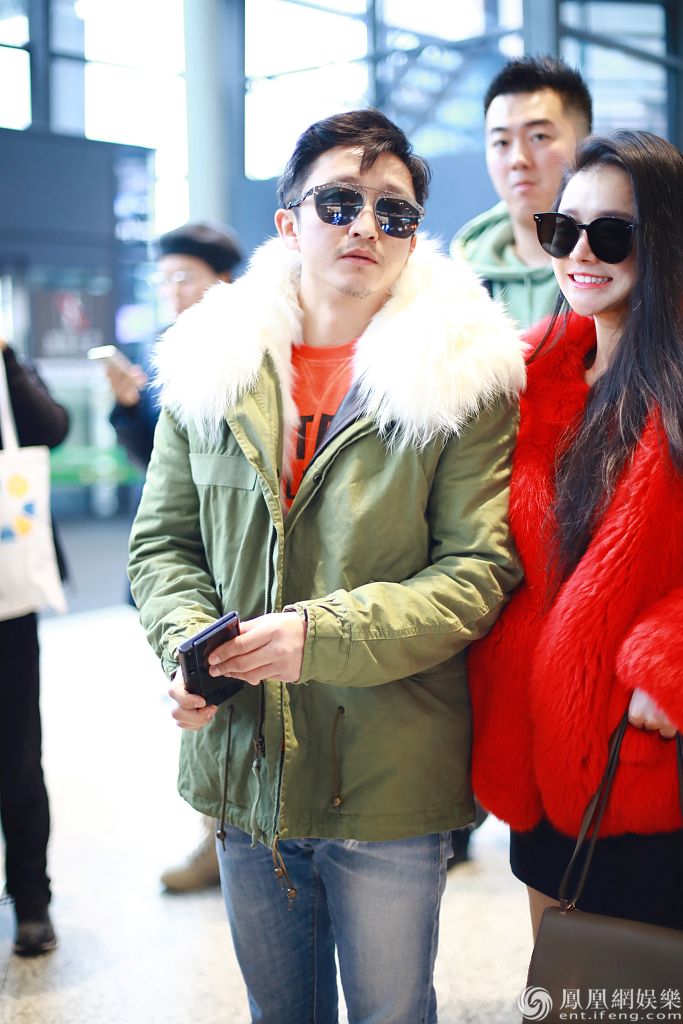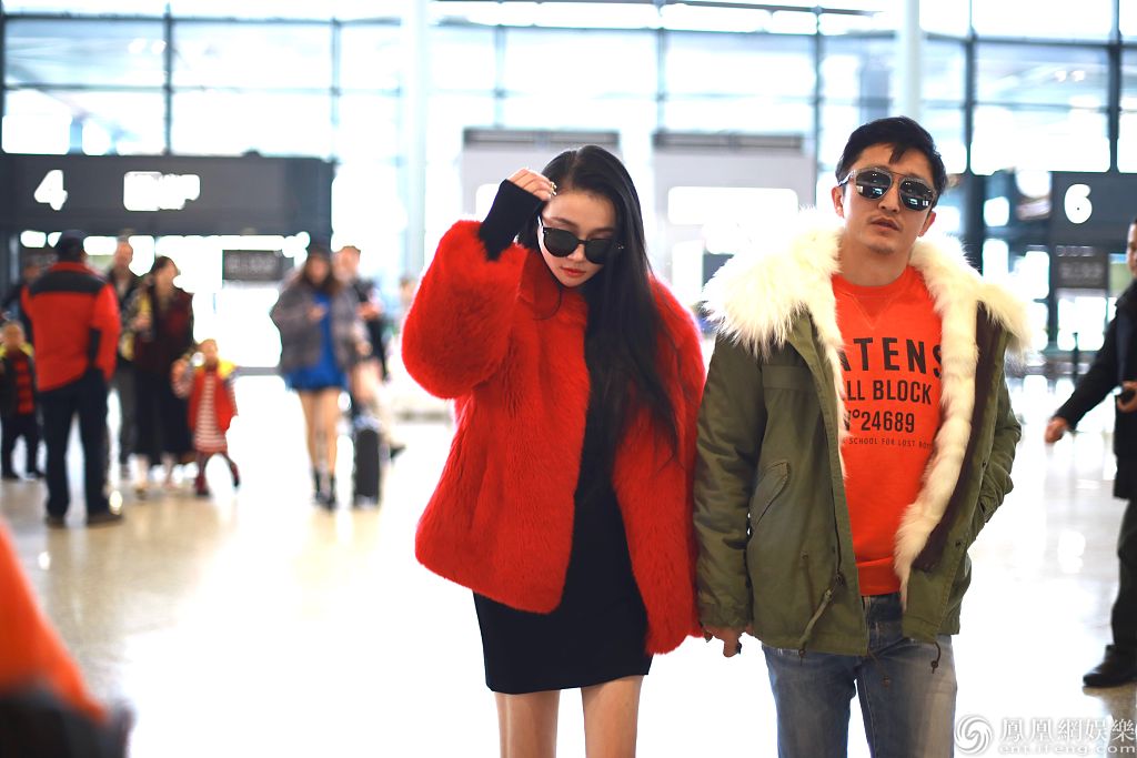 冉莹颖黑超遮面穿红毛绒外套贵气十足,获邹市明牵手超甜蜜,邹市明身穿军绿色派克大衣保暖帅气,简直就是会穿夫妻。
