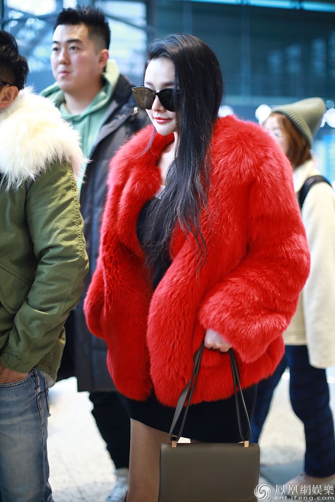 冉莹颖黑超遮面穿红毛绒外套贵气十足。