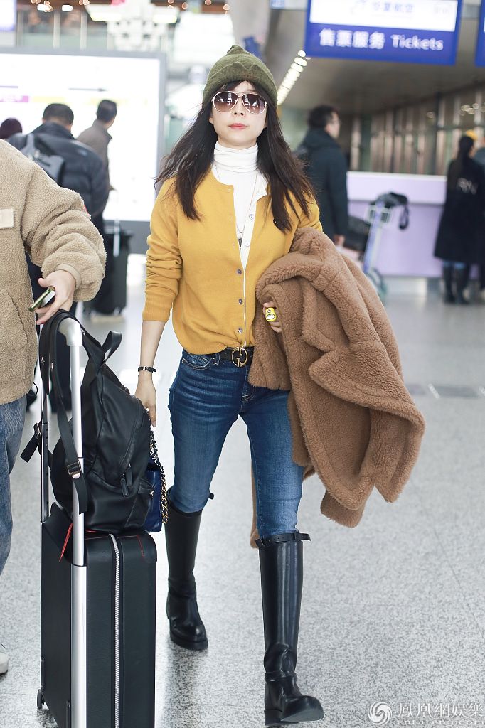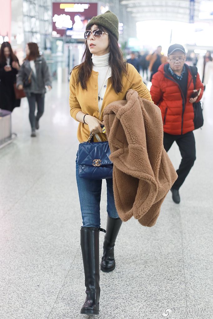张静初穿针织衫配高筒靴秀纤细美腿。