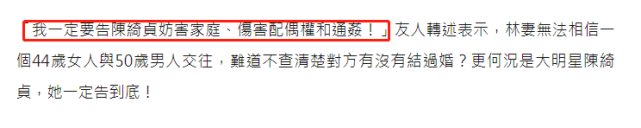显然正宫妻子对陈绮贞给出的回应很是不能相信,表示:“一个44岁女人与50岁男人交往,难道不查清楚对方有没有结过婚?”儿女在看到爸爸曝出这样的不伦绯闻受到了极大的伤害,对于破坏自己家庭的陈绮贞,妻子表示自己一定会告到底。