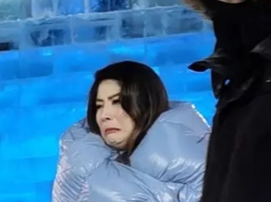 画面中,陈慧琳在零下20度的天气里,虽然穿着厚厚的羽绒款晚礼服,但还是抵挡不过寒意,仍被冻到表情管理失败。