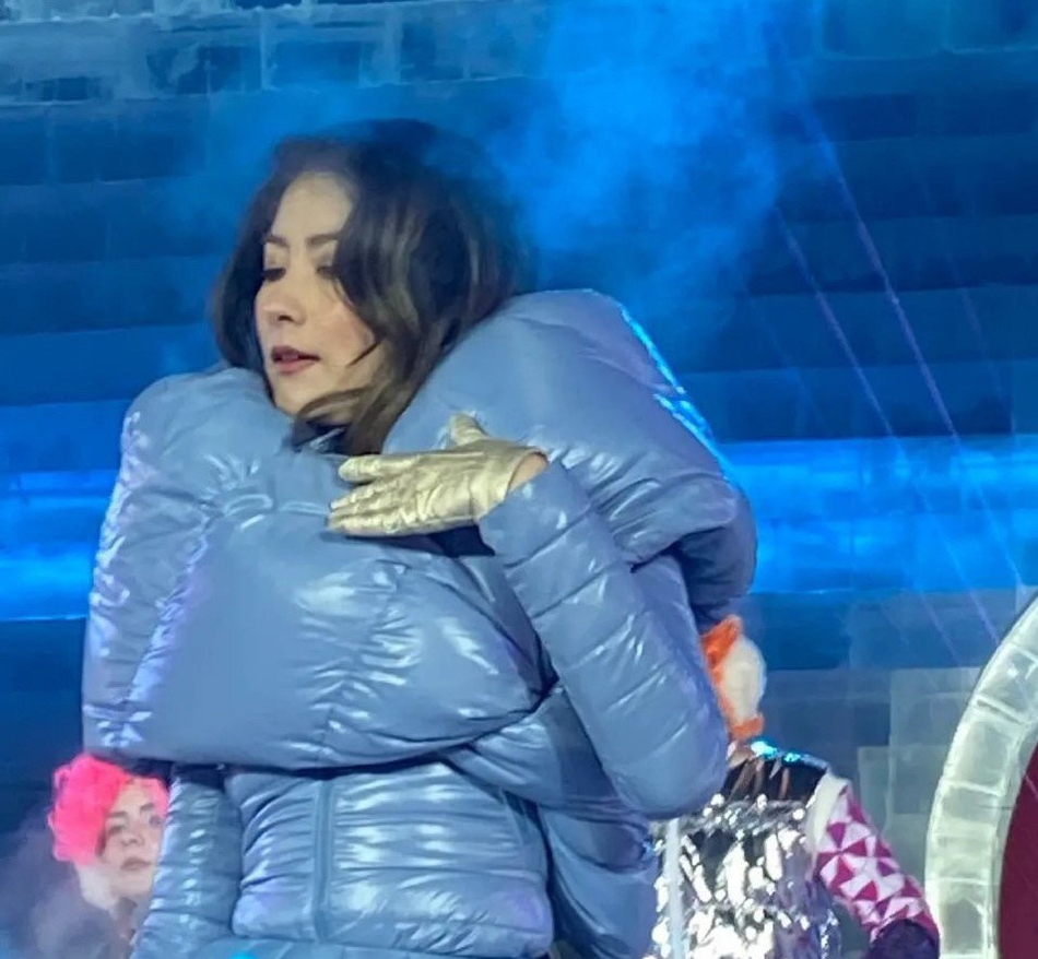 陈慧琳身穿厚厚的羽绒礼服在舞台上表演。