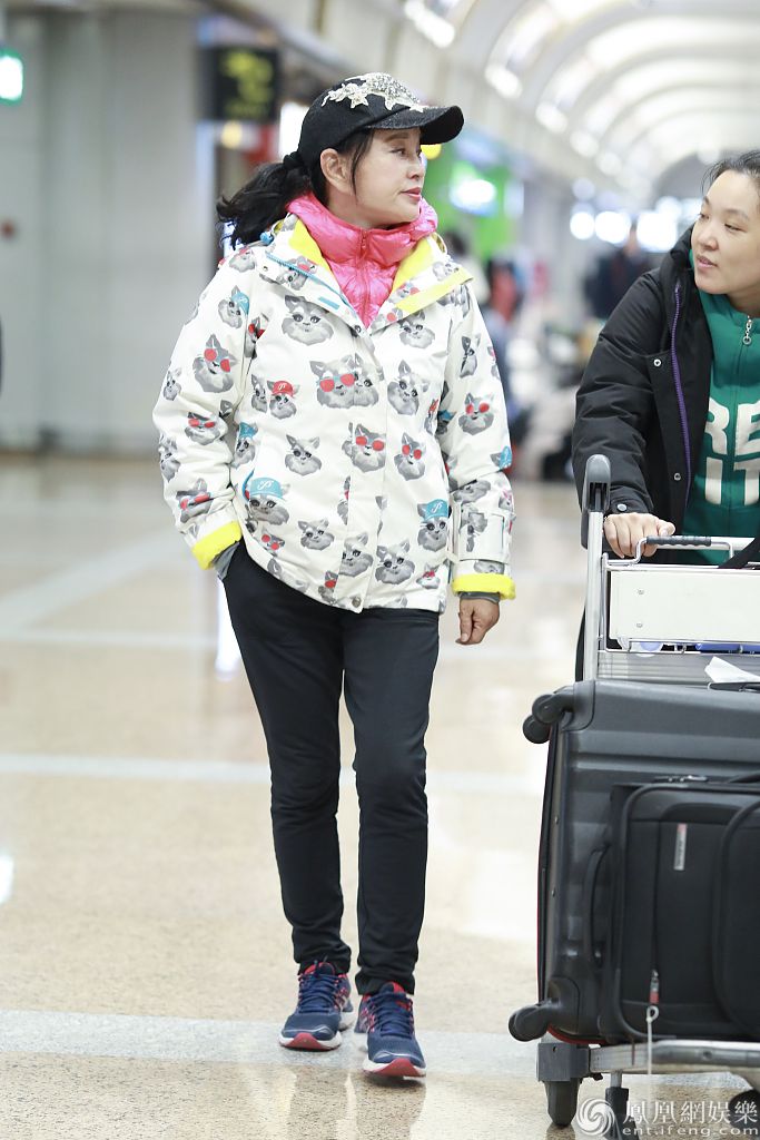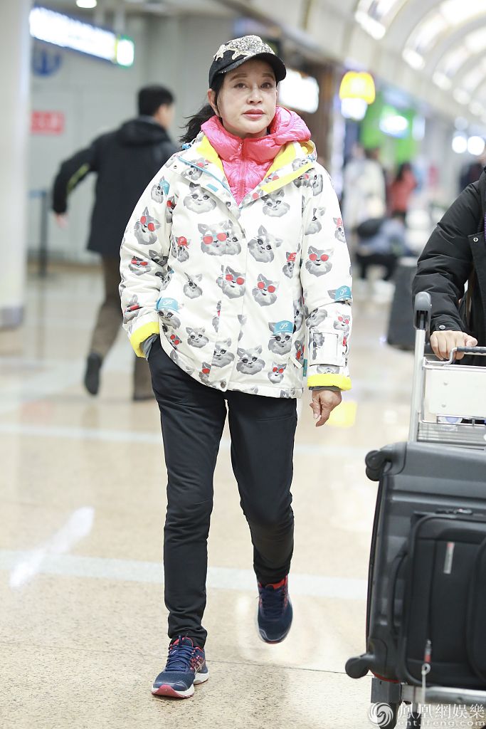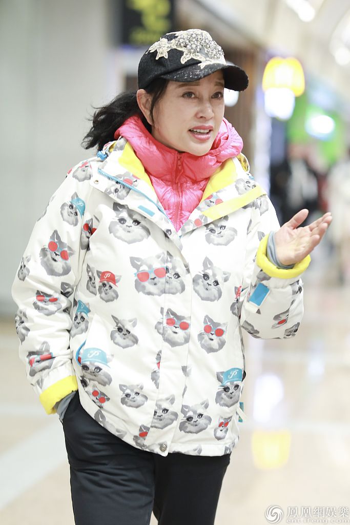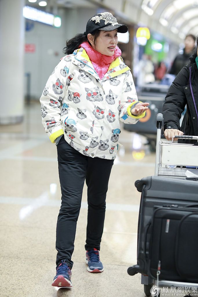 她身穿猫咪外套内搭粉嫩羽绒服清新减龄, 单手插兜脚踩运动鞋超接地气,不时与助理热聊十分随性。