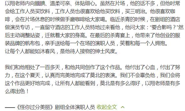 在高以翔噩耗传出后,《怪你过分美丽》官微便发了一条长微博来悼念。回忆了高以翔在拍摄期间的点滴细节,真实感人。并且表示说会将作品更好地完成,让所有人都能看到,高以翔老师是多么得出色!