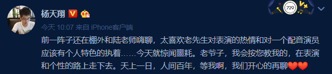 多名配演演员发文表示不敢相信,青年演员杨天翔表示:“前一阵子还在棚外和陆老师嗨聊。”今天就惊闻噩耗。