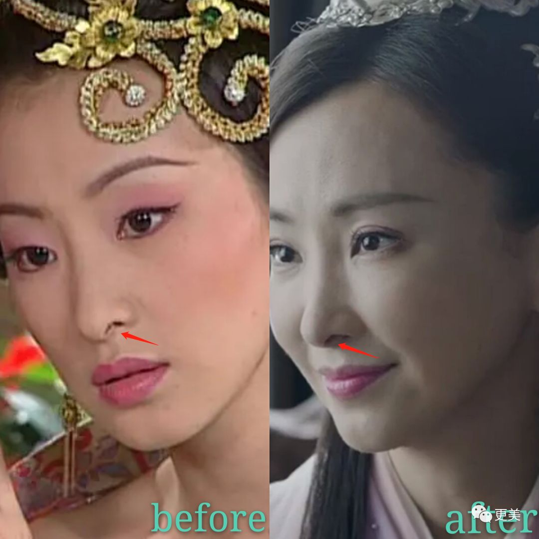 鼻尖疑似缩短过,没以前那么明显了,气质柔和了许多。苹果肌过度饱满,目测填充过。