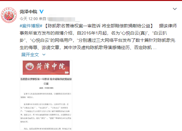 12月13日,山东省菏泽市中级人民法院官方微博发布案件播报,陈凯歌名誉维权案一审胜诉,并将全部赔偿款捐献给公益。