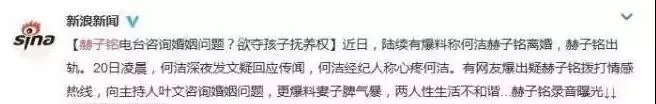 16年一段疑似赫子铭向某感情电台,求助的录音被曝光,录音里透露了他和妻子两人感情破裂,X生活不和谐,而且妻子还喜欢喝酒、撒谎,脾气也很大等问题。